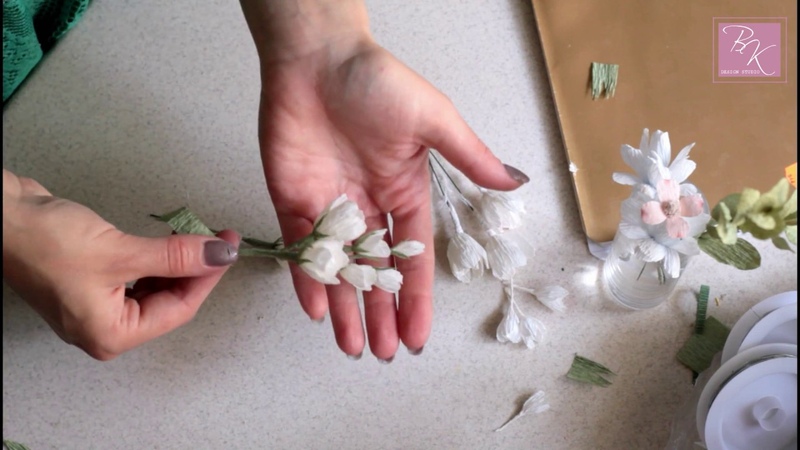 Согните пополам и скрутите пару раз. Согните конец края, чтобы получился угол 90°. Вырежьте полоску из бумажного пакета и обмотайте вокруг провода. Приклейте листья и цветок готов. Вы можете покрасить цветы, добавить блеск, в общем, все, что пожелаете.