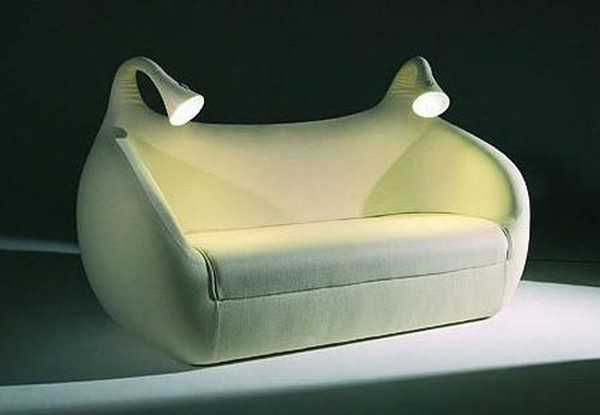 К примеру, вот этот красный модный диван оснащен встроенными светильниками. По-моему, это очень классно. Захотелось тебе почитать — всё под рукой!