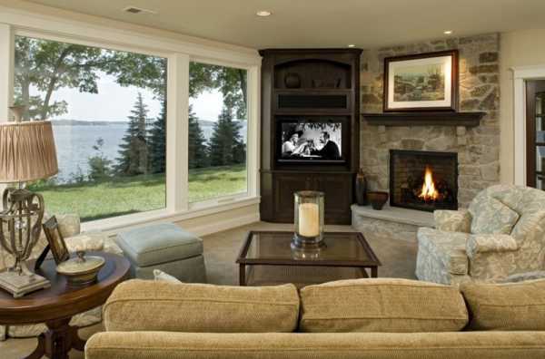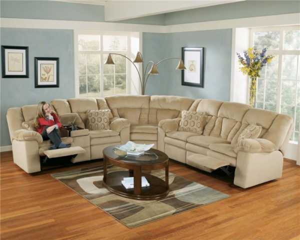 При рациональном размещении больших угловых диванов в гостиной сохраняется больше свободного пространства и исключается использование дополнительных элементов мебели.