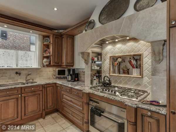 Кухня со стилизованной газовой плитой и коллекцией старинной посуды из металла, дизайнер Suzanne Kasler