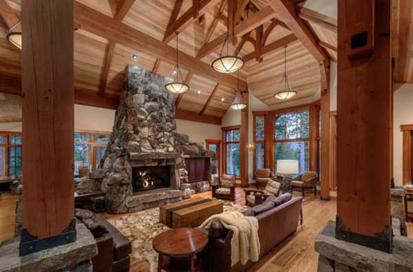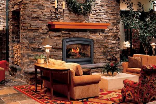 Камин с облицовкой из грубоватого природного камня и охотничьи трофеи помогут воссоздать стиль американского кантри