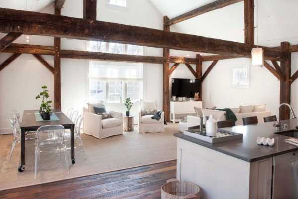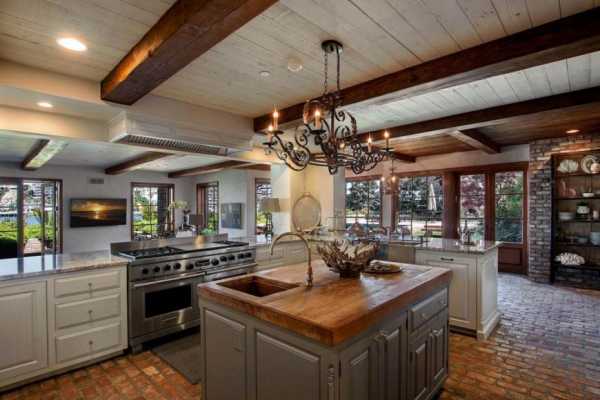 Открытые балки перекрытия можно использовать для крепления кухонных рейлингов и картин, их украсить связками красного перца, букетами засушенных цветов.