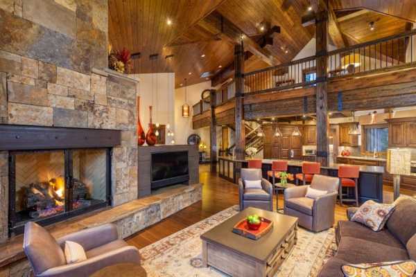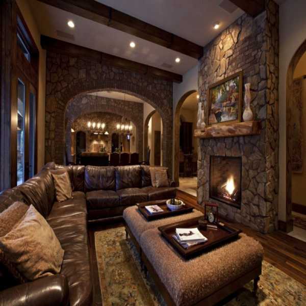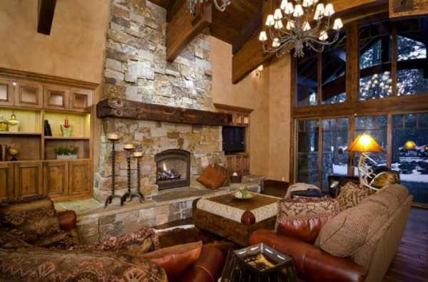 Камин — обязательный предмет интерьера. Напротив камина располагается уютный диван или массивное кресло. У стульев и кресел есть отличительная особенность — высокая спинка. Это удобно и располагает к долгим беседам.