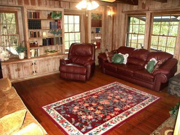 Присущие деревенскому стилю нарочитая грубоватость и шероховатость смягчаются в гостиной мягкостью мебели и ковров, «ламповым» освещением.