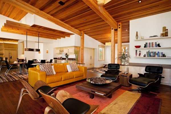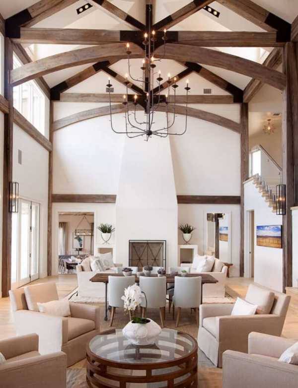 - однотонный (лучше белый) потолок с деревянными балками;