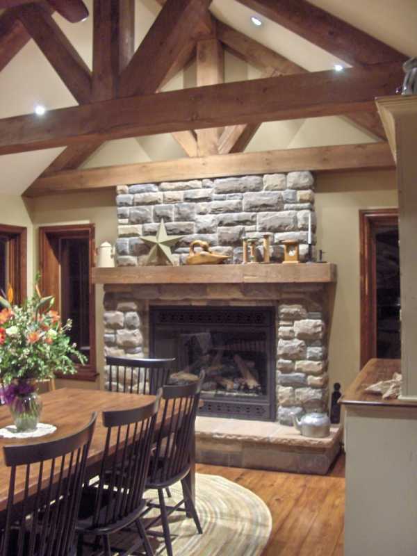 Американский интерьер в кантри-стиле также отличается солидной основательностью, однако лишен всякого украшательства и вычурного, это, скорее, не изящный коттедж в глубинке, а добротное лесное ранчо охотника. Наряду с натуральным деревом для такого дерева характерно использование грубого, фактурного камня в отделке стен и каминов, которые являются практически обязательным элементом американского кантри-интерьера. Другой характерный элемент такого интерьера — деревянные потолочные балки, которые могут выполнять исключительно декоративную роль.