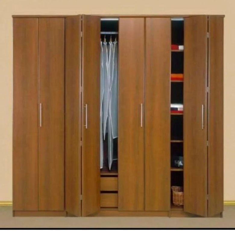 Основное достоинство такой конструкции – возможность использовать такие двери в самых узких местах с большой проходимостью (коридоры) не перекрывая пространство и не создавая помех для других жильцов при пользовании шкафом.