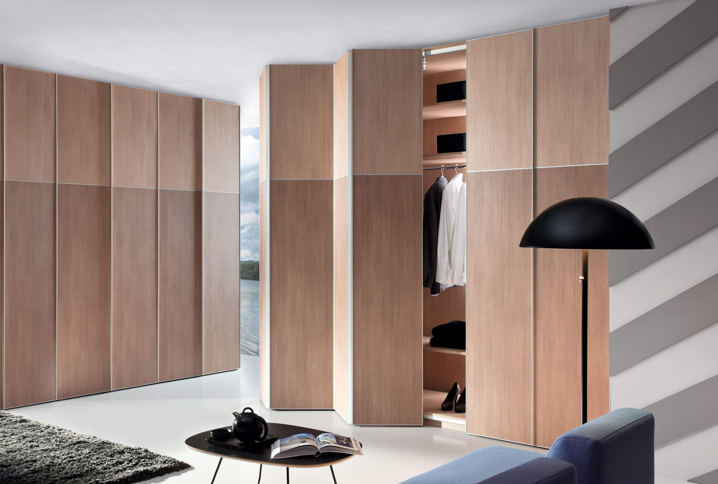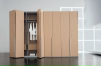 Позволяя получить одновременный доступ ко всему внутреннему пространству шкафа такая, система требует значительного места по бокам от встроенного шкафа, куда могла бы сдвигаться дверь (двери).