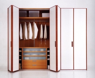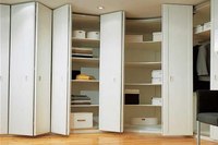Для гардеробной или шкафа-купе иногда устанавливаются раздвижные двери-гармошка. Это является прекрасной альтернативой для дорогих систем купе. Лучше всего такой вид двери поставить в гардеробную или во встроенный шкаф. Преимущество перед распашными дверями очевидное — человек получает больший доступ к своим вещам, которые размещены в шкафу.
