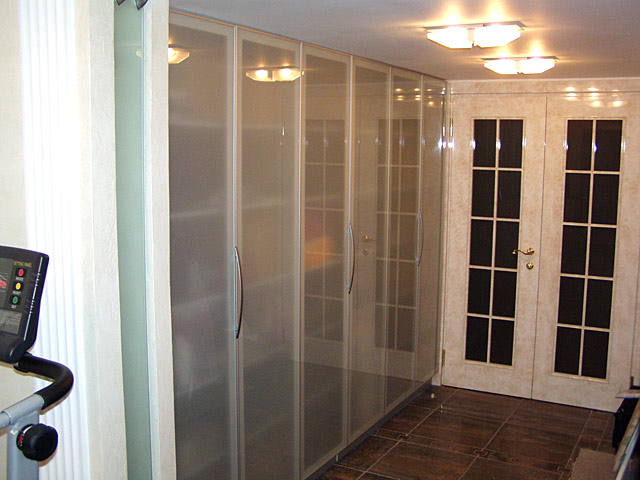 Двери кладовой, по образцу которых будут смоделированы двери гардероба Варианта 2, с матовым или текстурированным стеклом, и каждая дверь на 1-2 дюйма шире: