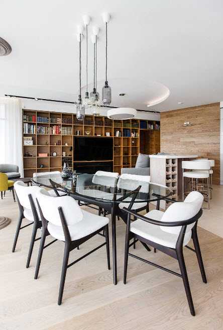 В современном коттедже с большой площадью может быть несколько вариантов расположения зоны приготовления пищи и сегмента для трапез: