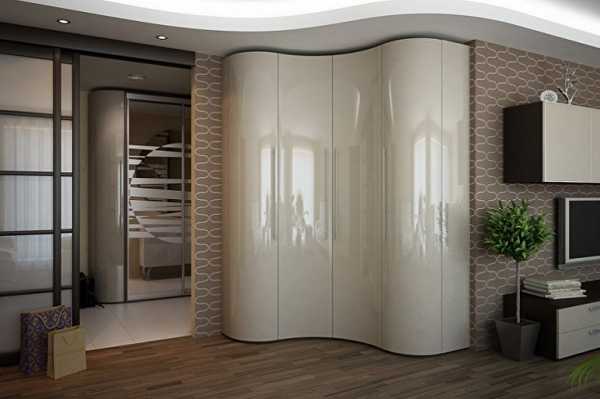 Радиусный шкаф – это вариация углового шкафа. Для очень маленькой прихожей он не подойдет, но если пространство позволяет, такая конструкция будет смотреться оригинально, и точно украсит помещение. Главное, чтобы стилистически она с ним совпадала.