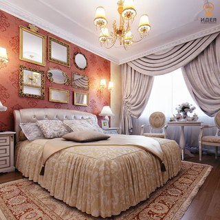 Для того, чтобы задекорировать окно в классической спальне, выбирают двухслойные шторы с легкими тюлевыми гардинами и тяжелыми портьерами. Занавеси украшают ламбрекенами и подхватами с кисточками. Обустраивая помещение в данном стиле, очень тщательно подбирают постельное белье.