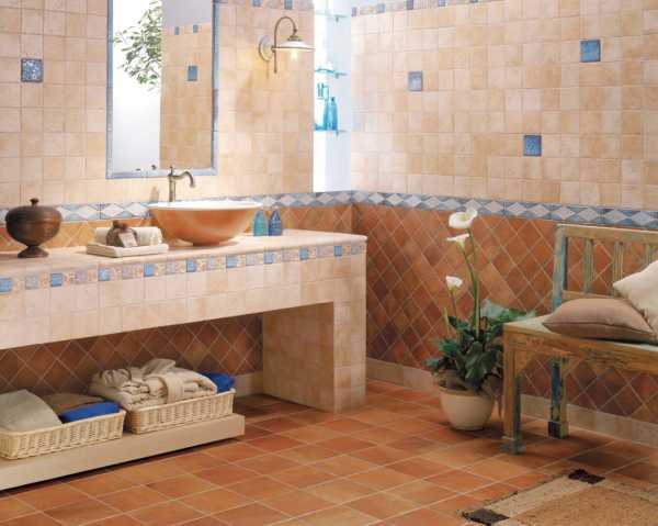 Большее спокойствие и нежность цвета предполагает стиль кантри. Его отличают пастельные, нежные тона, а также популярные нынче древесные оттенки. Для стен в данном случае вы можете использовать нежно-розовую, кремовую плитку, лавандовую, нежно-голубую. Для пола у ванны подойдет плитка терракотовых оттенков. Нужны варианты именно неярких, размытых оттенков. Подойдет плитка с эффектом состаренности, потертости, этаким временным переходом.