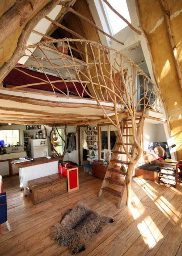 Вместо прямых косоуров появились плавные изогнутые линии. При взгляде на лестницу создавалось впечатление, что она стекает, скручиваясь в восьмерку. Точеные балясины и самое главное – изогнутые перила! Они сделаны из цельного древесного ствола.