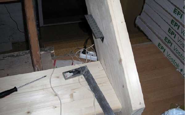 Сама технология установки столба довольно хитрая. Нужно немного поддомкратить потолок с помощью длинного рычага (горизонтальной доски) и вертикальной доски, стоящей рядом с нашим столбом. Далее установить наш столб, убрать вертикальную доску, и, таким образом, наш столб окажется зажатым (путем распорки) между потолком и площадкой: