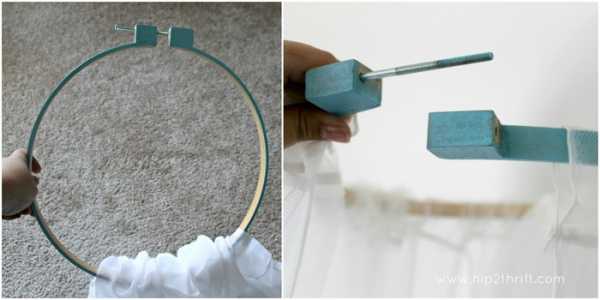 Этот метод немного проще. Нужны пяльца большого диаметра. Внешний круг цепляется на балдахин, а вокруг нижнего надо повесить крест накрест веревку и все это соединить. После этого завинтите пяльца посильнее и приготовьтесь к закреплению полученной конструкции над спальным ложем. Сделайте крюк на потолке либо привинтите каркасную основу к стенке.