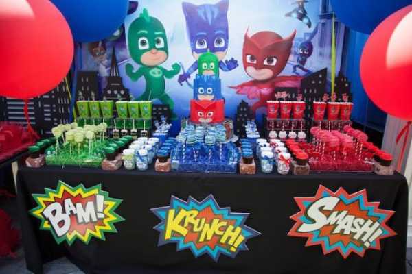 В качестве угощения подойдут яркие фруктовые закуски, пирожные, разноцветные конфеты и лимонады.