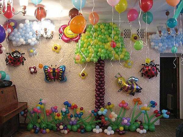 Далее следует закрепить основу дерева в вазе или горшке. После нужно украсить каждый отросток ветки небольшими сюрпризами. Для этого рекомендуется повесить на дерево разноцветные бумажные или тканевые мешочки, внутри которых будут находиться различные сладости. Этот вариант украшения комнаты обязательно порадует пятилетнего ребёнка и его друзей.Надувные игрушки