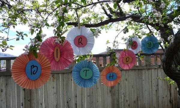 Самое известное бумажное украшение на праздник – это, конечно, растяжка с надписью «С днём рождения!» Но, кроме этого, существует множество других вариантов декора с использованием такого материала. К примеру, можно сделать красивые объёмные шары и цветы из разноцветной гофрированной бумаги и развесить их в верхней части комнаты, используя нитки. Такие украшения раскачиваются из стороны в сторону при малейшем движении воздуха, привлекая к себе внимание.