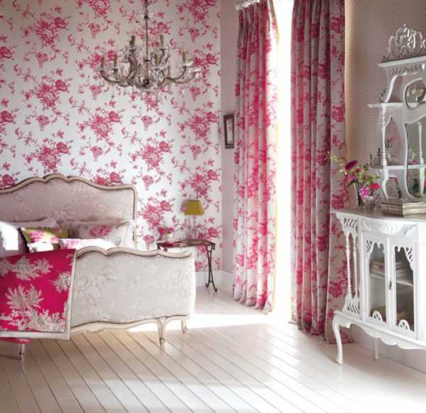 - Цветы создают женственную, романтическую атмосферу. Выбор мелкого цветочного орнамента характерен для английского стиля, прованс, ретро, шебби-шик (пример на фото).