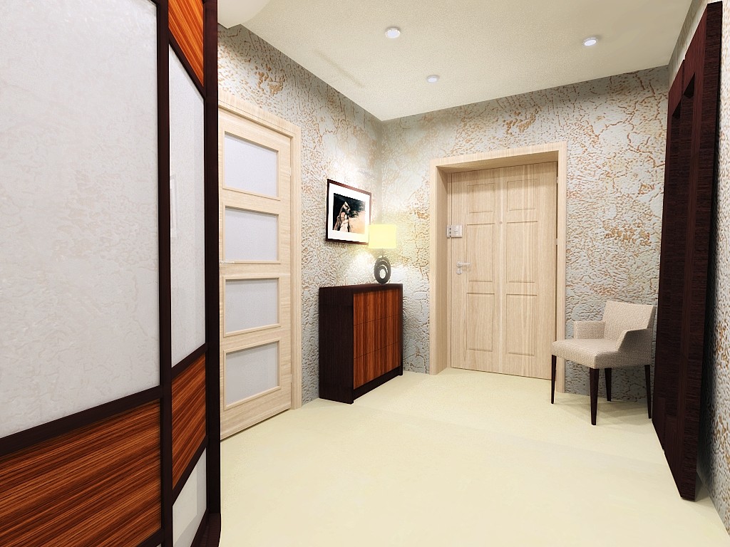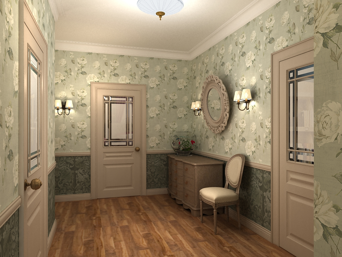 Кроме того, подойдут обои с изображением цветов, а также с мелким орнаментом, с пестрыми, красными, синими и белыми цветами. В то же время в маленькой и узкой комнате не рекомендуется использовать обои с вертикальными полосами, так как это может зрительно уменьшить и без того небольшой по площади коридор.Кроме того, для создания привлекательного интерьера советуем позаботиться о хорошем освещении, так как тусклый свет также зрительно уменьшает площадь помещения. Интересно будет смотреться переход из коридора в кухню, который часто делается с созданием арки, но без двери.