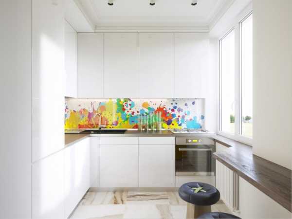 Причем предпочтение стоит отдать не обилию узоров, а однотонным поверхностям. Незатейливый рисунок плитки или оригинальная фотопечать вполне могут стать главным преимуществом интерьера кухонь на 9 кв.м.