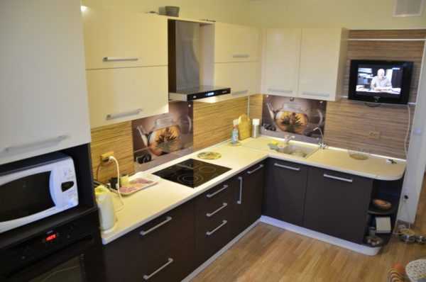 Угловой гарнитур занимает две смежные глухие стены. Чаще всего здесь уже подведена вода и газ или электричество, и жильцам ничего не приходится выдумывать. Сдвинуть расположение мойки и плиты немного можно, но, как правило, в пределах 1-1,5 метров.