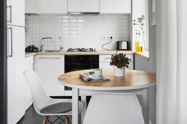 - При удачной форме помещения обычный подоконник можно заменить более широкой столешницей или оснастить складным столом. Вместо табуреток можно выбрать высокие пуфы с местами для хранения внутри.