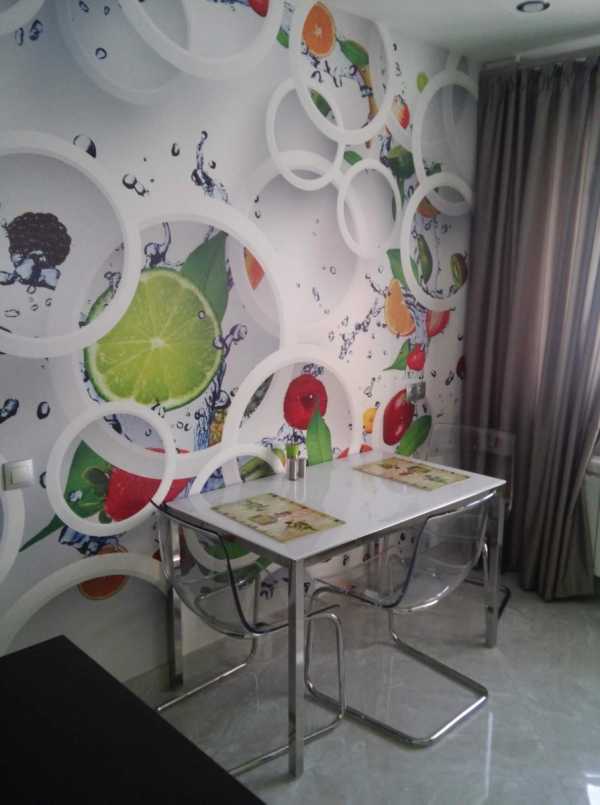 Если на кухне остается незадействованной какая-либо стена, ее можно украсить необычными обоями или панно с фотопечатью. Рисунок может разместиться на фасаде гарнитура и даже на двери.