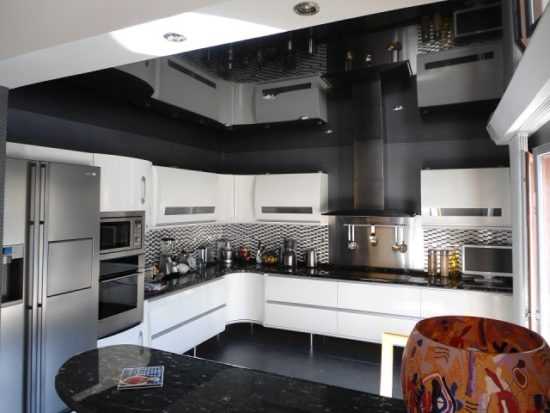 Для небольших низких комнат наиболее подходящим цветом потолка и преимущественным фоном верхних фасадов будет воздушный белый. При этом нижняя часть гарнитура и пол оформляются в устойчивом черном оттенке. Благодаря такому приему кухонная зона визуально вытягивается вверх и кажется просторнее. Для строгого монохромного интерьера подойдет только идеально гладкий потолок преимущественно белого цвета. Горизонтальные элементы на стенах помогут визуально расширить узкие места комнаты. Вертикальные контрастные полосы зрительно делают помещение выше.