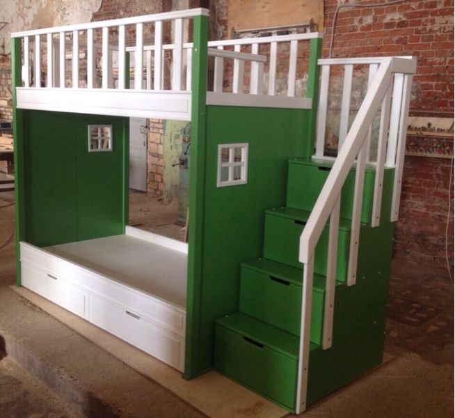 Для малыша 2-4 лет подойдет модель с игровым уголком внизу. Это может быть домик, закрытый шторками уголок с местом для хранения игрушек. Выглядят они, как на фото.