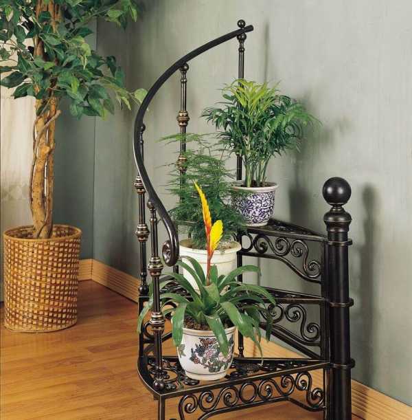 Красочному и гармоничному размещению растений способствует использование небольших декоративных стоек с витиеватыми растительными узорами. Их применение оправдано в случае оформления комнаты в стиле эко или прованс. Для первого случая идеальный вариант — конструкция из натурального дерева, для второго — белое кованое исполнение.