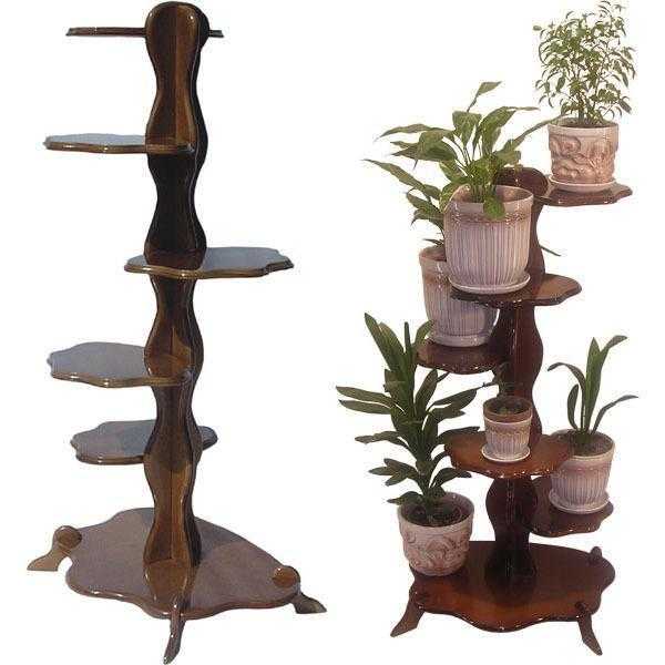 - Количество полочек-оснований в деревянных подставках обратно пропорционально диаметру. Чем он больше, тем меньше мест под горшки. 3-5 для крупных растений и до 12 – для фиалок и кактусов.