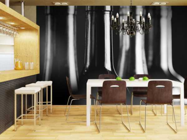 Если кухня оснащена барной стойкой, фотообои помогут выделить эту зону. Хорошо подходят урбанистические сюжеты, абстракция, черно-белые фотографии, сюрреалистические мотивы.