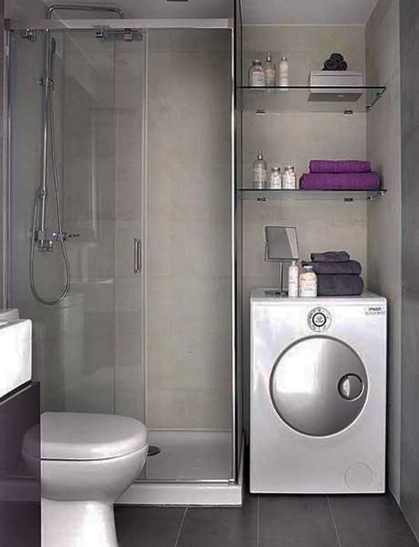 Малогабаритная современная модель стиральной машинки может занять свободную нишу под накладной раковиной; в шкафу над спрятанным сливным бачком; заполнить место, оставшееся между ванной / душевой кабинкой и стеной.