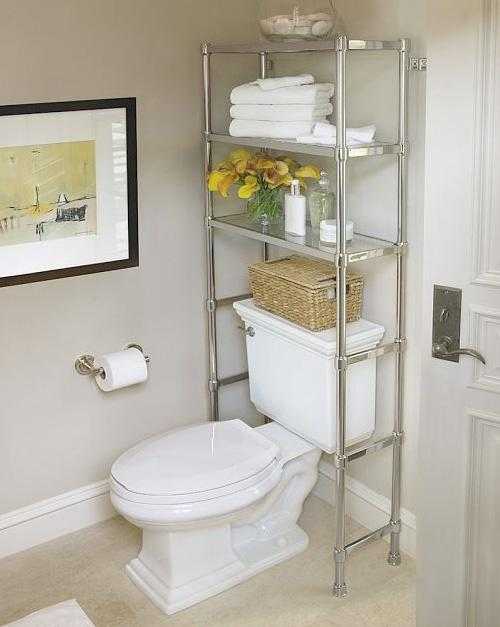 - Поместить все желаемое может помочь и комбинированная мебель. Места над и под умывальником занимаем различными тумбочками, полочками, сушилками для полотенец. Место над унитазом можно тоже занять, например, бойлером или полками.