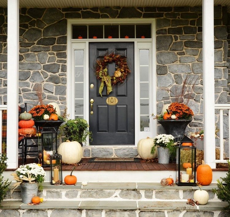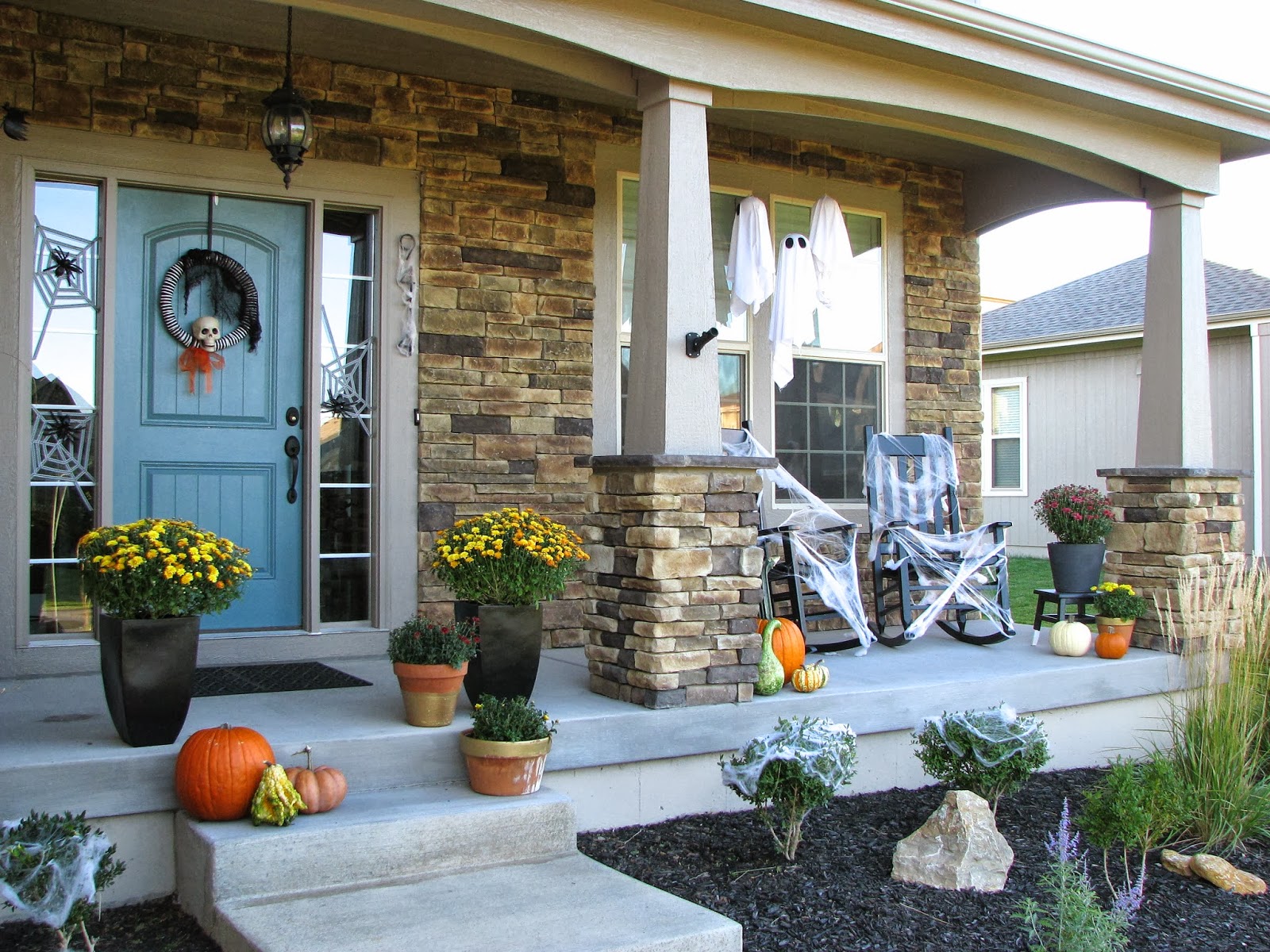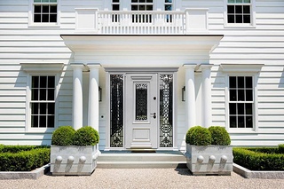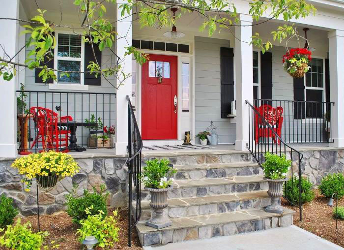 Если планируется установка цветов с горшками, следует их устанавливать с двух сторон двери или лестницы, чтобы избежать асимметрии оформления. Чтобы сделать парадный вход более уютным и в тоже время защититься от солнца, используйте легкие шторы. Если крыльцо одновременно является верандой, приобретите удобную садовую мебель.