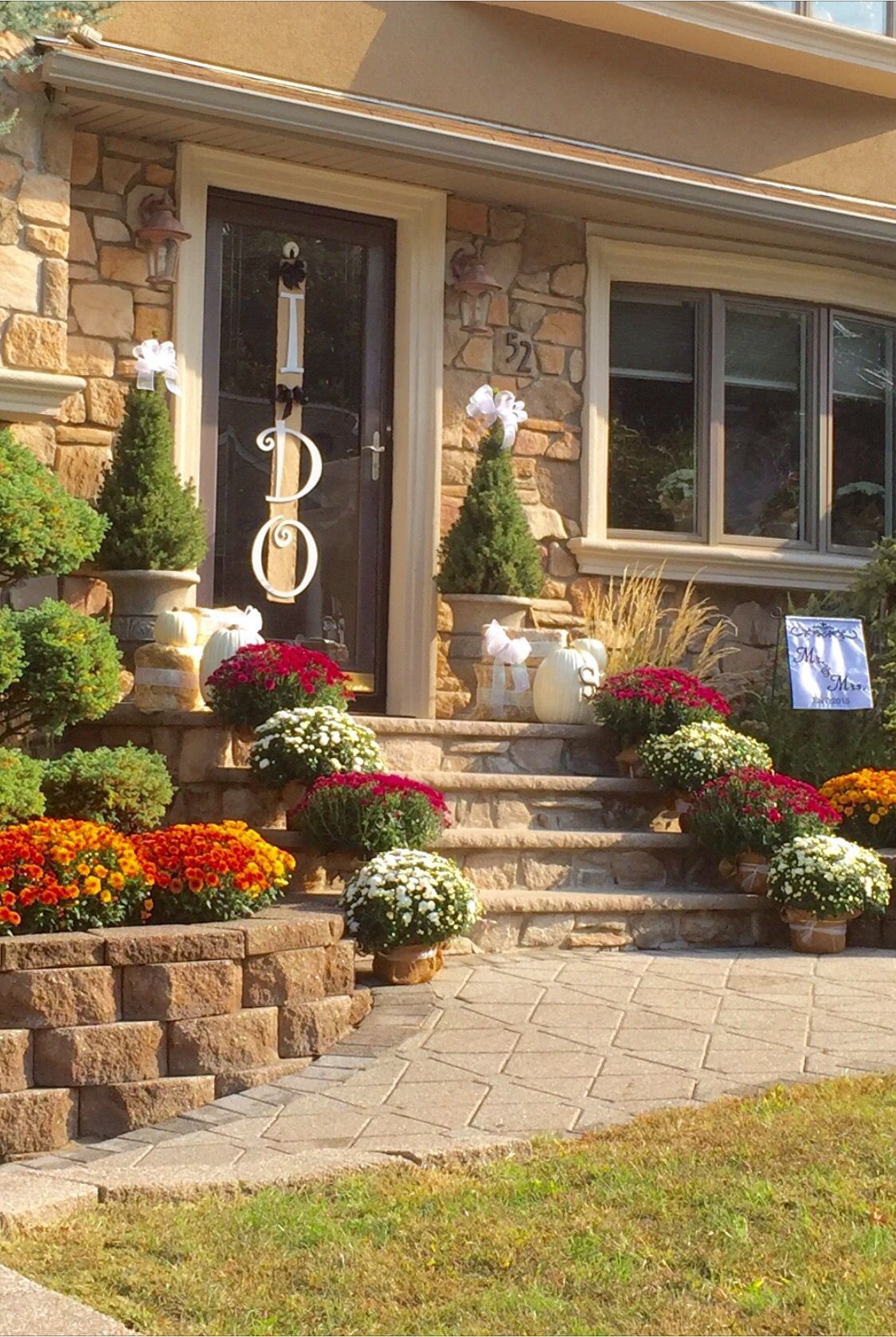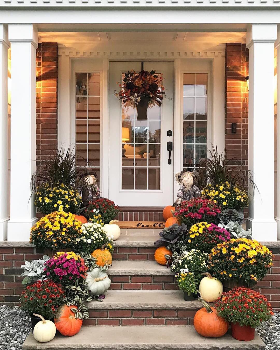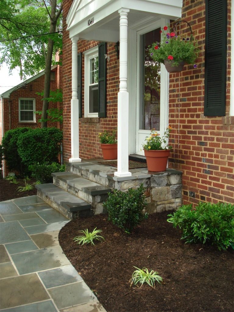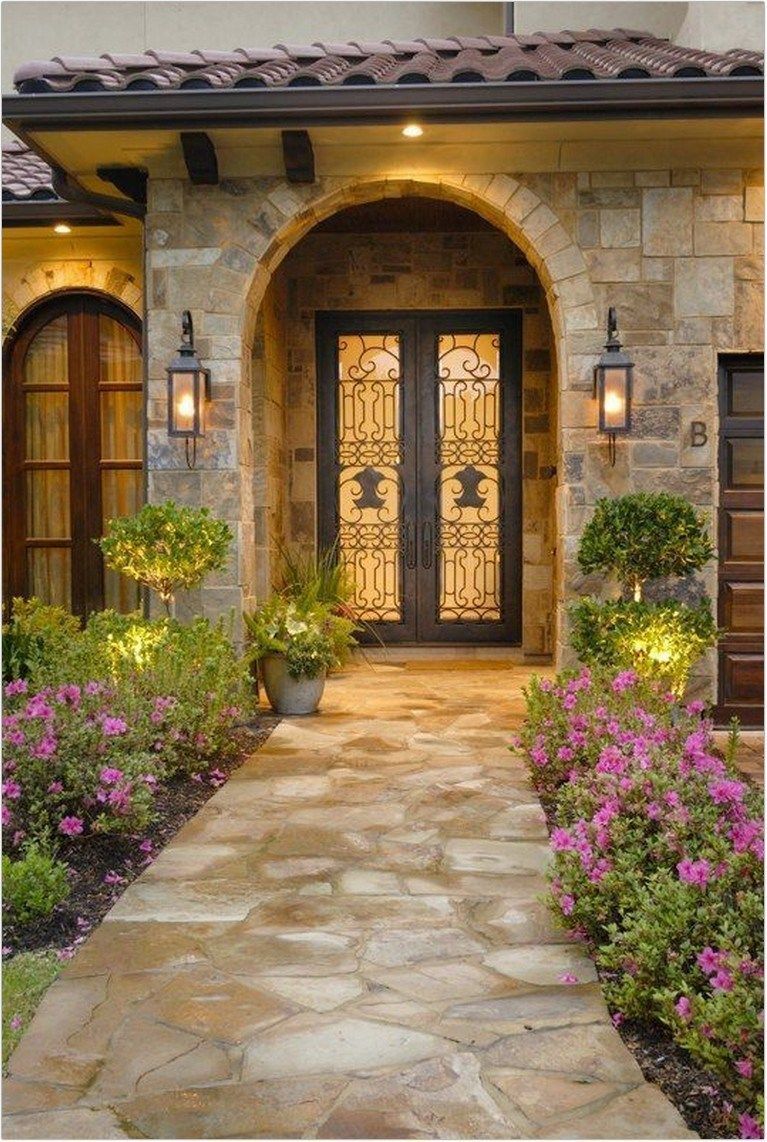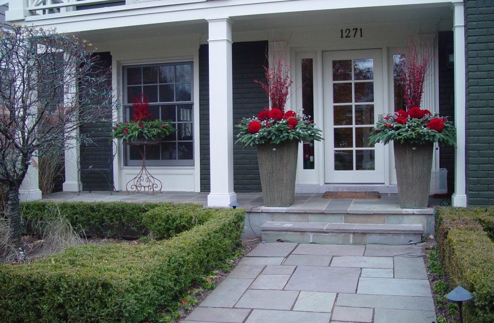 Это самый сложный элемент оформления. Цветы требуют постоянного ухода, хотя цветут несколько месяцев. Выбирайте простые цветовые схемы, которые содержат два или три оттенка. Следует соотносить тип цветов с общей стилистикой входа в дом. Для классического экстерьера подойдут розы светлых и сдержанных тонов. Для современного стиля выбирайте экзотические яркие растения. Не делайте цветы доминантой ландшафта, так как они будут отвлекать внимание от входа. Цветы являются дополнительным штрихом, который лишь подчеркнет задумку хозяина. Правильное и хорошо продуманное сочетание озеленения, сделает входную часть эффектной и привлекательной, а гости — приходящие в дом, будут довольны такому приему.