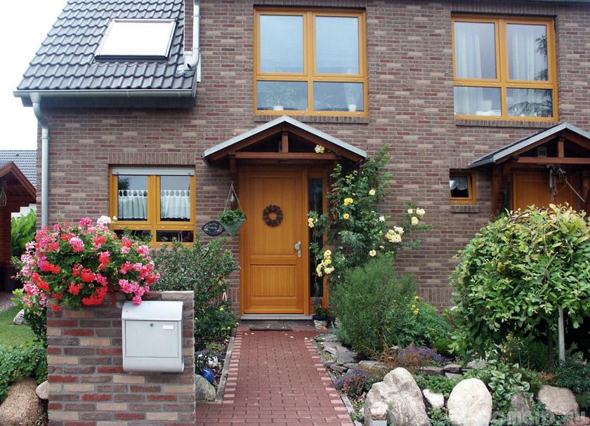 Количество цветов и зелени зависит от размера участка, располагающегося перед входом. Возможно использование солитерных композиций, состоящих из дубов, плакучих берез, яблонь, кленов. Также красиво смотрятся японские деревья, горные сосны или кустовые розы. Классическим стилем в оформлении коттеджа является наличие зеленого газона, живой изгороди, которую образуют кусковые растения и дорожки, ведущей прямо под дверь.