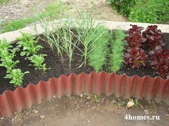 Некогда один из самых распространенных материалов для ограждения гряд, шифер и по сей день часто используется огородниками.
