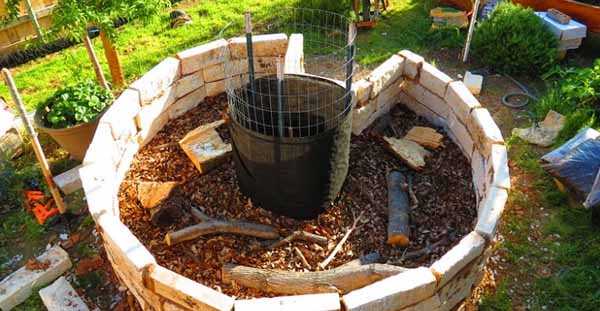 На дно грядки кладут ветки, корни, бумагу, компост. Посередине грядки проходит туннель для свежих органических отходов и воды.