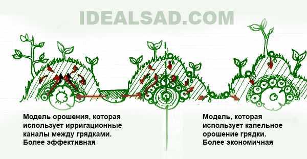 Для орошения насыпных высоких грядок используют иррригационную систему орошения, когда вода поступает из канавы между грядками — хороший вариант для затапливаемых по весне огородов, или можно использовать капельный вариант орошения, когда вода поступает в грядку с мини террас.