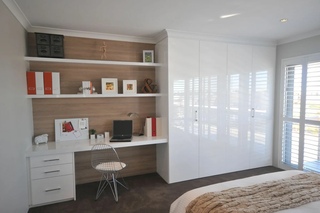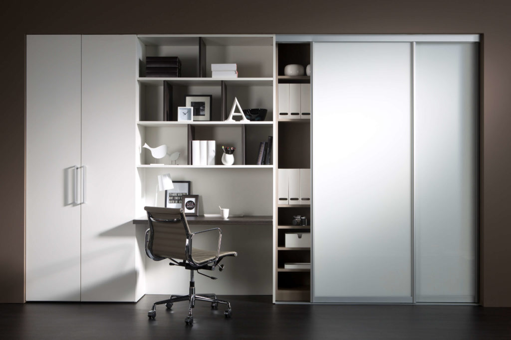Также сюда относится такой неординарный прием организации рабочего пространства, как письменный стол в нише встроенного бельевого шкафа. Раздвижные створки скрывают столешницу и стул и открываются, когда это необходимо. Платяные шкафы-трансформеры или модульные гарнитуры могут иметь разные виды створок. Наиболее удобны раздвижные варианты, поскольку они не требуют дополнительного пространства в комнате.