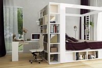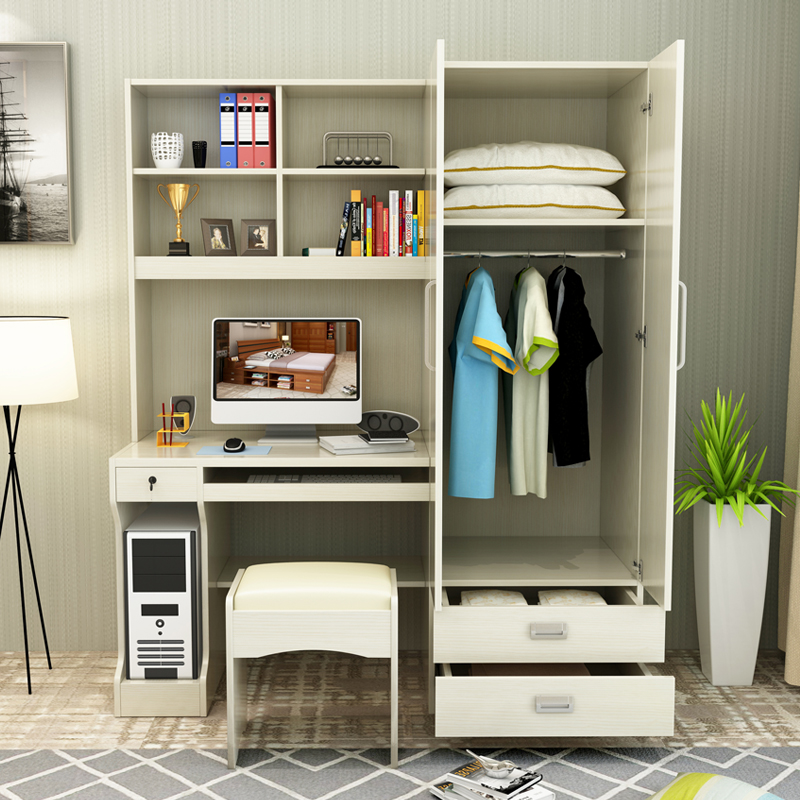 К тому же такой шкаф-трансформер может легко превратиться в рабочее место. Столешница может быть совмещена с платяным шкафом, но особенно удобно, когда над ней или вокруг нее устроены открытые полки и разнообразные ящики, позволяющие хранить рабочие и учебные материалы. Также их можно использовать для выставления памятных вещиц.