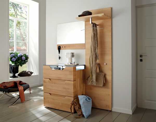 Мебель выбирайте узкую, не более 40 см, но вместительную. Обязательно выделите достаточно места для хранения верхней одежды и обуви, обращайте на это главное внимание. Также будет полезно иметь сиденье, чтобы удобно было надевать обувь, и полочки под различные мелочи.