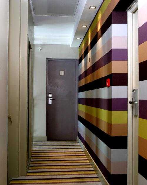 Оригинальное цветовое и орнаментальное решение визуально расширяет коридор, а светлый потолок создает чувство легкости