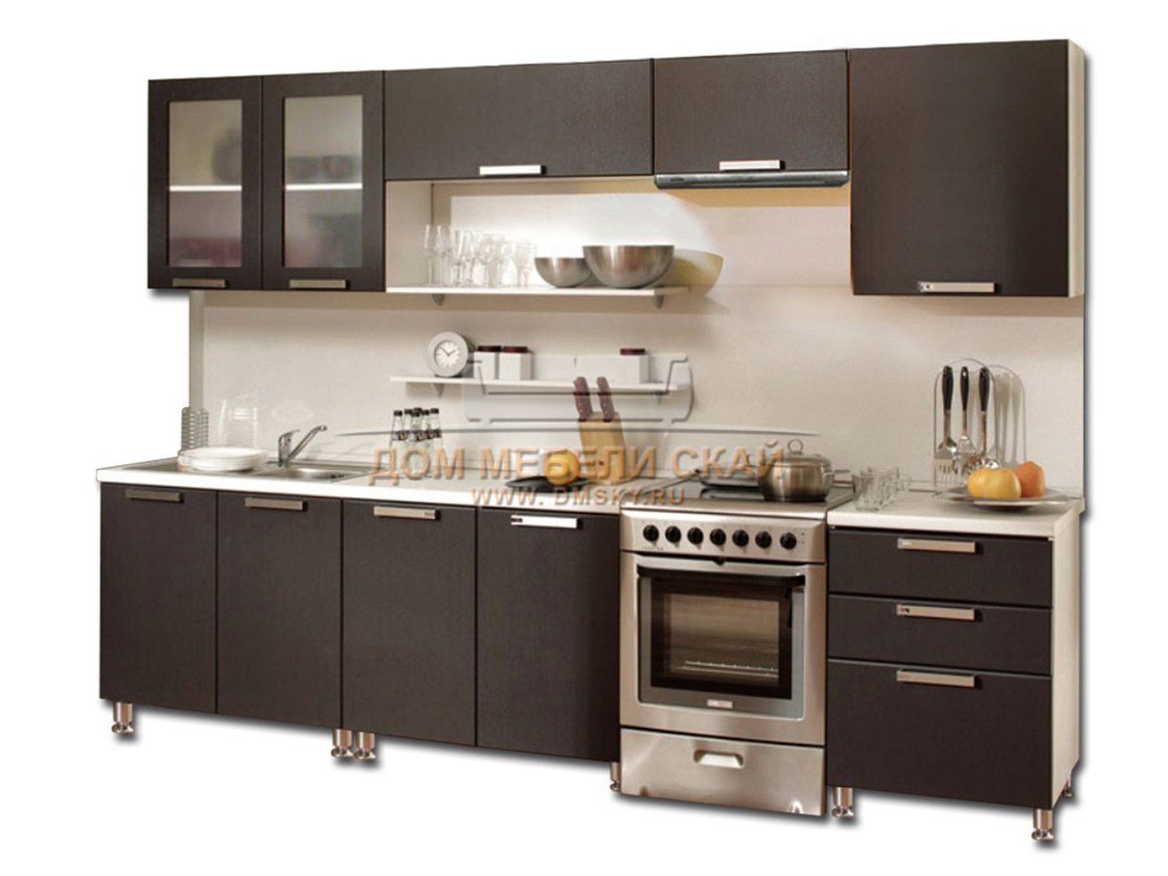 Глубокие тона темного дерева прекрасно подчеркнут выразительность фасадов кухни и красоту окружающего интерьера. Цвета кухни можно совместить — верхние шкафы кухни обычно делают светлого цвета, нижние темного коричневого или черного цвета. Популярны также бежевые кухни — они практичны, но в то же время стильно и гармонично смотрятся. Эффектным дополнением для таких гарнитуров станут элементы из стекла — стеклянные фасады для кухонных шкафов сейчас очень популярны.
