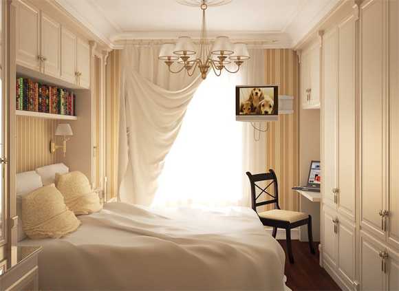 Для обустройства просторных комнат используются традиционные варианты со шкафом купе и двуспальной кроватью. В спальню с минимальными размерами достаточно трудно вместить громоздкий гарнитур, поэтому лучшим дизайнерским решением станет мебель, сделанная по индивидуальному заказу.