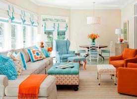 Комбинацией римских штор и тюля с портьерой можно подчеркнуть стиль помещения гостиной. Особое внимание стоит обратить не только на структуру ткани, но и цветовую гамму, чтобы вместе они составляли единый ансамбль. Можно подобрать римскую портьеру не только в тон основным занавескам, но и в тон стен. Здесь можно использовать гобелен.